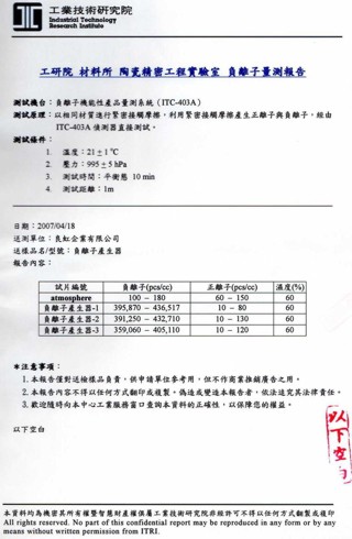 ․民國八十三年八月五日,台視八千里路雲和月節目,介紹大陸長壽村的秘密時指 稱,了當地居民的生活習性,水等為長壽的原因之外,重要的就是當地空氣中 的負離子含量高達每cc兩萬個之多,因此,前該村的居民年齡最高的活到一百 四十歲。相對的,根據非正式測試的結果,都市中一般家庭或辦公室,每cc空 氣中負離子含量則僅有一百五十個